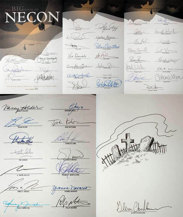 - Slipcased Deluxe Artist Edition of 150 signed and numbered copies, bound in a different full-cloth and Smyth sewn, signed by more than 50 contributors including Stephen King, featuring a different slipcase, different full-color signature sheets, an additional piece of color artwork, embossed endpapers, and original artwork by Glenn Chadbourne Issue Price = $350
